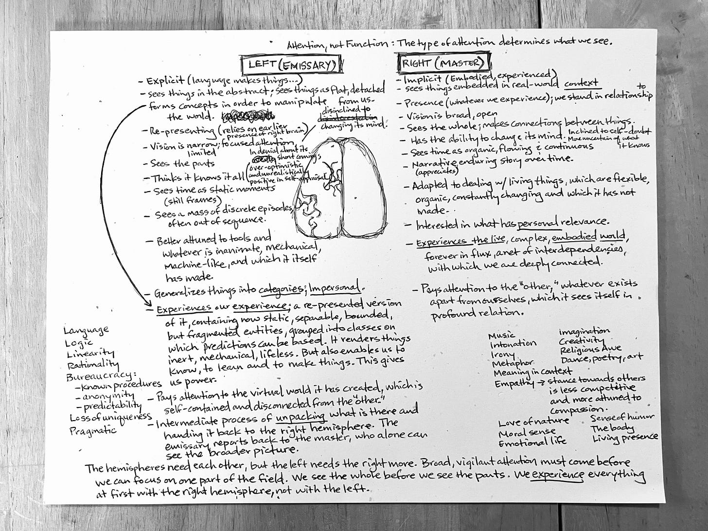 Ways of Attending: How Our Divided Brain Constructs the World by Iain McGilchrist1 is a good starting place to understand how each type of attention determines what we see.
